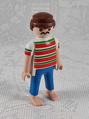 Mann mit Schnäuzer, weißes T-Shirt mit roten und grünen Streifen, blaue Hose, barfuß