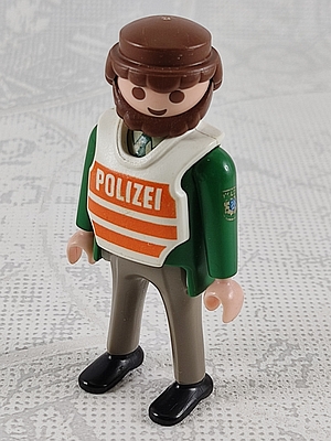 Polizist, dunkelgrüne Jacke und hellgrau Hose, gewellter Bart, Polizei-Logo auf dem linken Oberarm