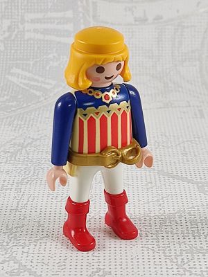 Mann weiße Hose, rote Stiefeln, hellgelbes, rot-gestreiftes Oberteil, goldener Schwert-Gurt