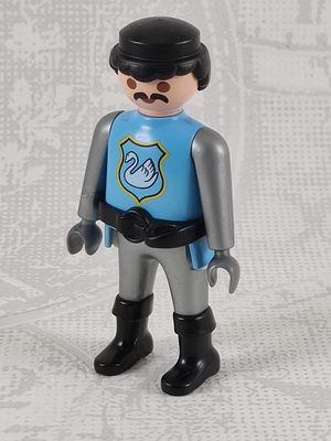 Mann h.blaues Oberteil mit Schwan-Aufdruck, Ärmel und Hose silber, schwarze Stiefel, aufgedruckter Schnäuzer, graue Hände