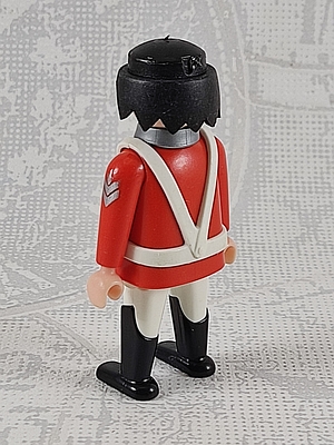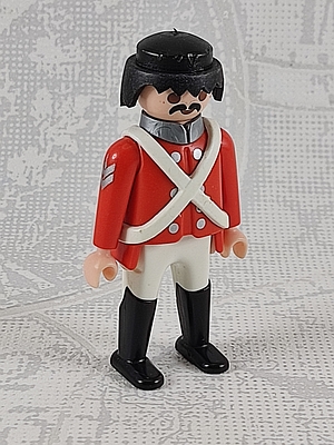 Soldat in roter Jacke mit zwei silbernen Knopfreihen, weißer gekreutzer Schultergurt, silberner Kragen, hohe schwarze Stiefel - schwarze Haare, aufgedruckter Schnäuzer