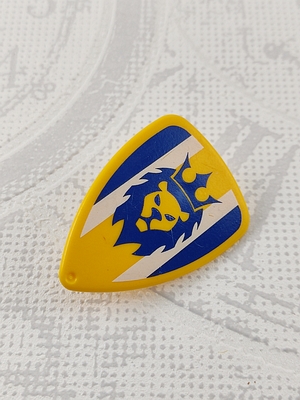 dreieckiges Schutzschild, abgerundete Ecken, blauer Löwenkopf mit Krone sowie blaue und weiße Streifen auf gelben Hintergrund