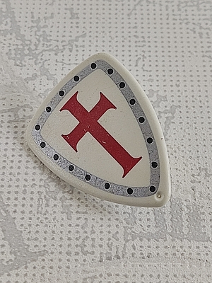 dreieckiges Schutzschild, abgerundete Ecken, rotes Kreuz mit silbernen Rahmen auf weißem Hintergrund