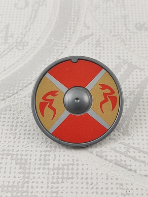 rundes Schild, silber, orange Schlangen auf gelben Hintergrund, Hintergrund: 2/4 gelb, 2/4 orange