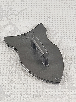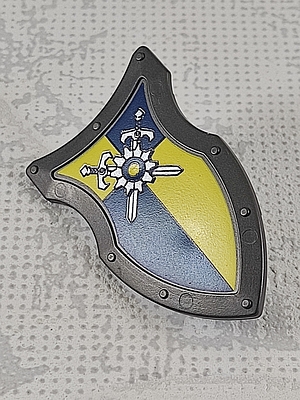 trpfenförmiges Schutzschild, dunkelgrau, zwei gekreuzte Schwerter silber auf gelb/blauem Hintergrund