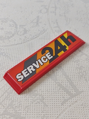 schmales, rechteckiges Schild, 9 cm x 2,4 cm, Kanten abgeschrägt mit Aufkleber "Service 24 h"