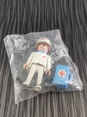 Mann, ganz weiß, hellblauer Kragen, rotes Kreuz auf der Brust, dem weißem Helm und dem hellblauen Koffer, schwarzes Stethoskop - in ungeöffneter, transparenter Originalverpackung