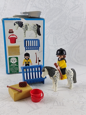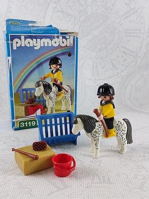 kleine Reiterin: 50003119_pr, Pony weiß/grau V1: 30624660, Heuraufe blau: 30223170, großer Eimer mit Henkel rot: 30660070_glanz / 30660070_matt, Strohballen schmal h.braun: 30660800 / 30069890, Putzzeug braun: 30606460, Reithelm Kind schwarz: 30070650