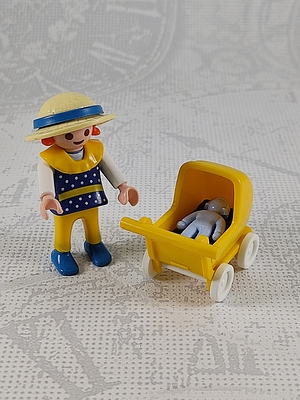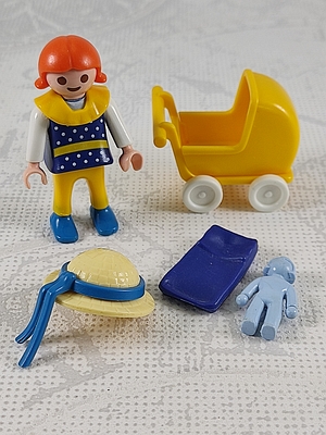 Puppenwagen Gestell gelb: 30038970, Oberteil gelb: 30038980, Matratze d.blau: 30216860, Wagenachse weiß: 30051230, Puppe h.blau: 30216870, Mädchen: 50004584_girl, Strohhut h.gelb: 30216840