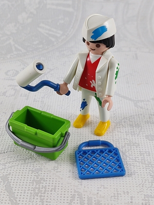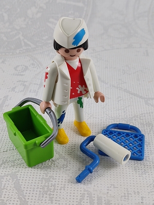 Maler-Mütze, Schiffchen weiß: 30624772, rechteckiger Eimer grün: 30233140, Eimer-Henkel grau: 30216140, Farb-Abstreifgitter blau: 30216150, Farbrolle Griff blau: 30216170, Farbrolle weiß: 30216160