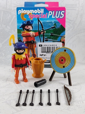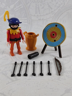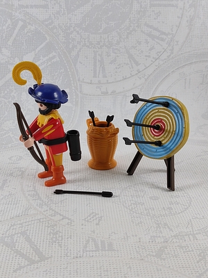 Bogenschütze: 30000813, Zacken-Hut b.blau: 30248350, Hutfeder gebogen gelb: 30216800, Köcher für Gürtel schwarz: 30022810, Bogen d.braun: 30056790, sechs Pfeile schwarz: 30510302, hoher Korb h.braun: 30071720, Korb Oberteil h.braun: 30468110, Zielscheibe bunt: 30631703, Zielscheiben Stander 2-teilig d.braun: 30601922