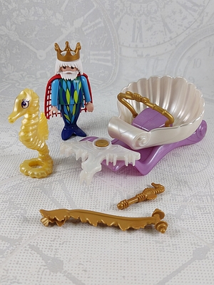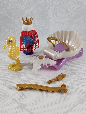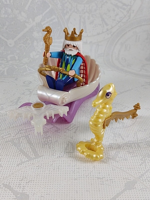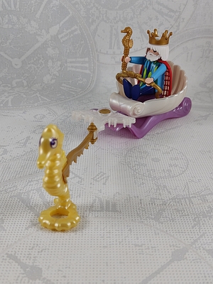 Meereskönig, Nixenmann: 30006092, Gitter-Umhang rot: 30027900, Krone gold: 30209460, Zepter mit Seepferd-Kopf gold: 30297680, See-Kutsche Unterteil helllila: 30297670, See-Kutsche Muschel weiß: 30297640, See-Kutsche Deichsel weiß: 30297660, See-Kutsche Haltegriff gold: 30297650, See-Kutsche Zugstange gold: 30297100, großes Seepferdchen gelb: 30643732