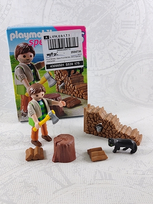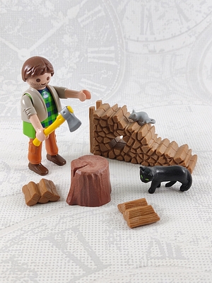 Holzhacker mit grauer Weste: 30002373, Axt gelb/grau: 30098980, Feuerholz, Holzscheite braun: 30058570, großer Holzstapel braun: 30513830, Baumstumpf d.braun: 30255902, Maus grau: 30209040, Katze schwarz: 30222662