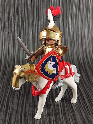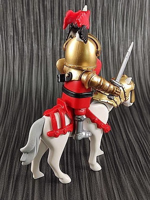 Ritter Christopher: 30003623, Pferd weiß: 30672590, Schwert grau: 30076420, Schutzschild rot: 30630594, Gürtel-Waffenhalter schwarz: 30208050, Waffen Halte-Clip schwarz: 30247320, Helmfeder rot: 30229950, Helmfeder schwarz: 30259900, Helm-Deko Pferdekopf weiß: 30246900, Sattel rot: 30247530, Ritterhelm gold: 35248852, Visir gold: 35214602, Pferd Kopfschutz gold: 35221033, Armschutz gold: 35221043