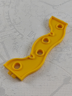 gelbes, gewelltes Brett zur Befestigung der Schaukel am Spielturm, Spielplatz