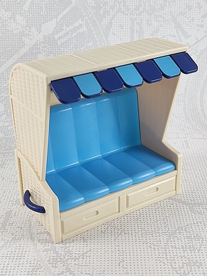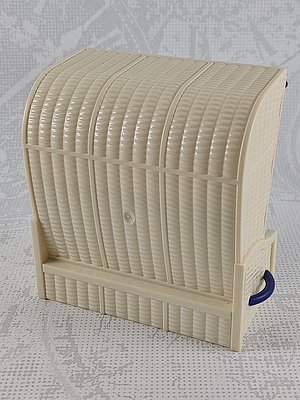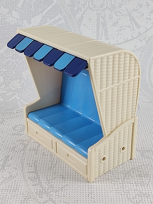 creme-farbender Strandkorb mit hellblauer Sitzbank, blau-gestreiftes Vordach und einem dunkelblauen Griff an der Seite (der zweite Griff fehlt)