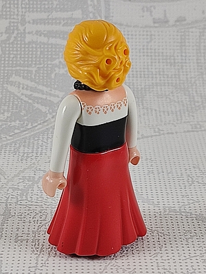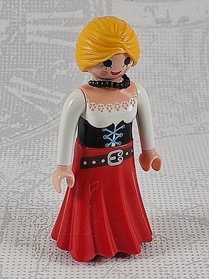Frau in weißer Bluse mit langem, roten Rock; schwarze Perlenkette; blonde Steckfrisur