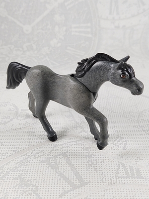 d.graues Pferd mit schwarzer Mähne und Schweif, natürlich aussehende braun-weiße Augen