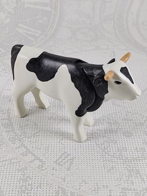 Stier mit beigen Hörnern, das Fell ist weiß mit schwarzen Flecken