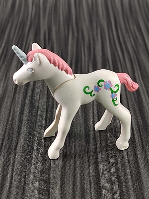 Fohlen weiß mit pinker Mähne und Schweif, Blumenmuster, hellblaue Augen und Horn
