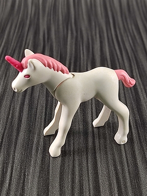 Fohlen weiß mit pinker Mähne und Schweif, magenta Augen und Horn
