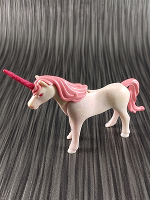 hellrosa gespenkeltes Pferd mit rosa Mähne und Schweif, Horn und Augen d.pink