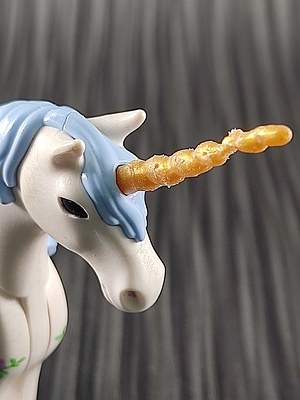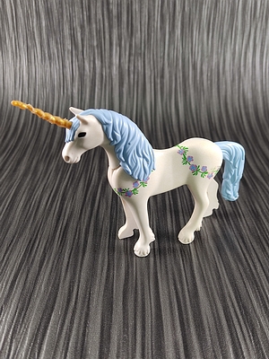 weißes Pferd mit hellblauer Mähne und Schweif, Blumenmuster, schwarze Augen, goldenes Horn (leicht beschädigt - siehe Foto 2)