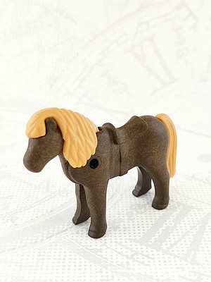 Shetland Pony - mit Sattel und hellbrauner Mähne links