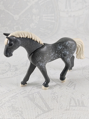 d.graues Pferd mit weißer Maserung, weiße Mähne und Schweif