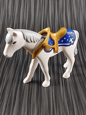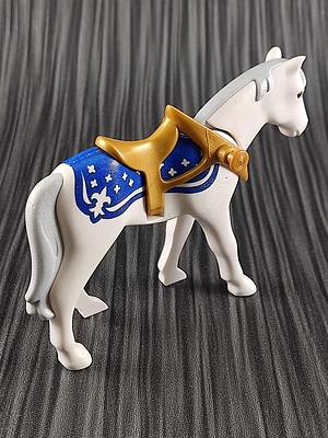 weißes Pferd mit aufgedruckter blauer Decke inklusive goldenem Zuggeschirr