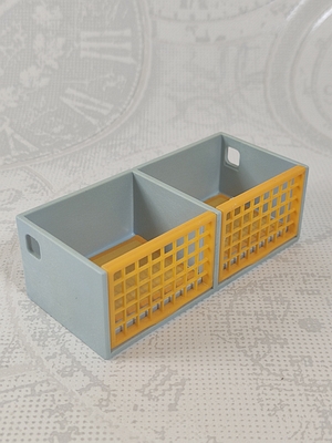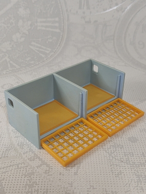 hellblaue Box, Käfig, mit zwei gelben Gitterklappen / Gittertüren