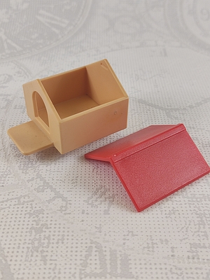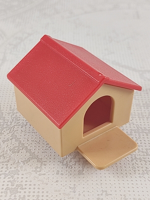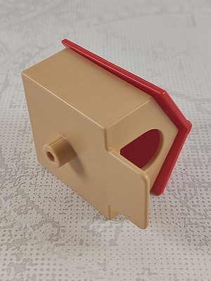 kleines, beiges Haus mit Außenplattform und Steckpin an der Unterseite, rotes Dach, für Meerschweinchen, Hasen, Kaninchen