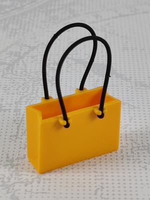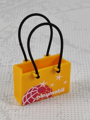 dunkelgelbe Einkaufstasche, Tüte mit zwei Henkeln und weißem Aufdruck "Playmobil" und Sterne sowie rot/weiße Kugel