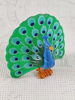 Pfau mit aufgestelltem Federrad, grün mit blauen Punkte