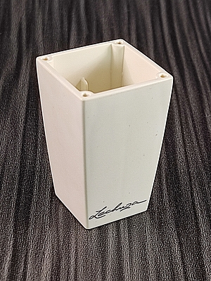 großer, hoher Blumentopf, weiß mit Aufdruck "Lechuza"