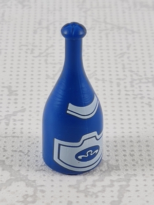 dunkelblaue Sektflasche mit weißem, aufgedruckten Etikett