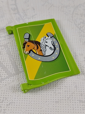 große rechteckige, hellgrüne Fahne mit (mindestens) einem Aufkleber: zwei Pferdeköpfe und ein Hufeisen