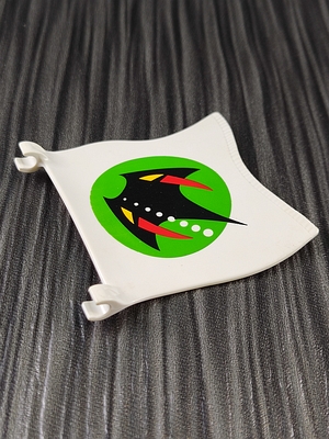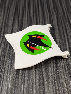 große viereckige, weiße Fahne mit Aufdruck auf beiden Seiten: grüner Kreis und schwarzer Rochen