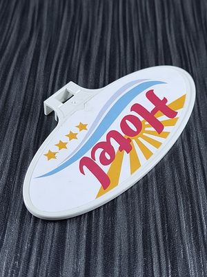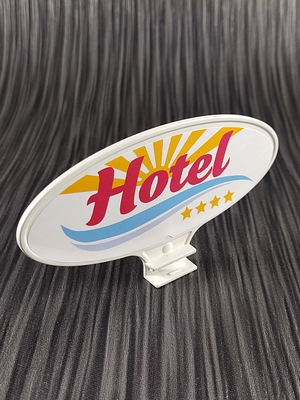ovales, weißes Schild mit Aufkleber "Hotel" auf beiden Seiten
