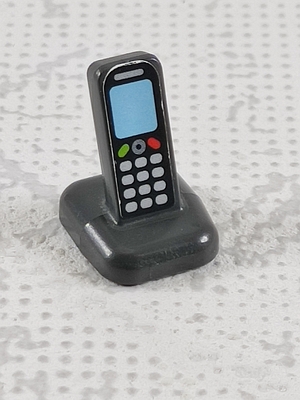 dunkelgraues, schnurloses Telefon in Ladestation (fest verbunden) mit blauem Aufkleber