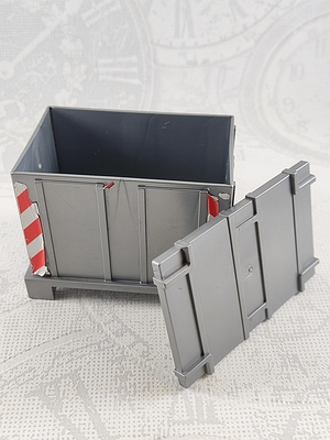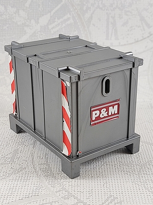 Container, 2-teilig: Kiste und Deckel mit Aufkleber "P & M" (auf beiden Seitenteilen) und vier Warnstreifen