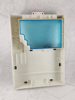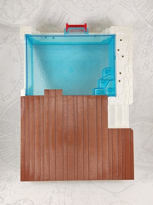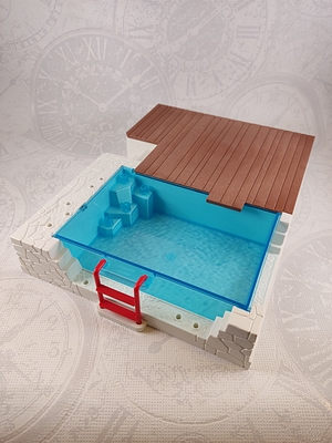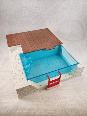 weißer Swimming Pool mit Steinmauern, brauner Holzterasse und roter Pool-Leiter, das Becken kann mit Wasser befüllt werden, ca. 27 cm x 19,5 cm