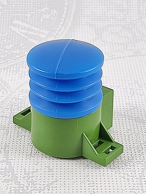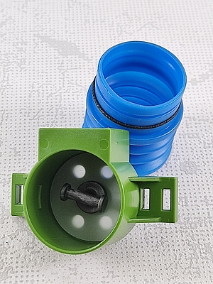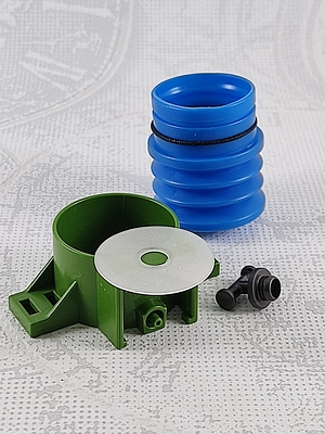 Wasserpumpe für Dusche: grünes Unterteil, Standfuß, Tank mit blauem Wasserpumpenbalg, Dichtungsring / O-Ring, Dichtungsmembran und grauem Halter