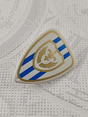 dreieckiges Schutzschild, abgerundete Ecken, goldenes Wappen und blaue Streifen auf weißem Hintergrund
