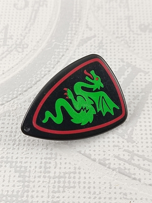dreieckiges Schutzschild, abgerundete Ecken, grüner Drache auf schwarzem Hintergrund, roter Rahmen