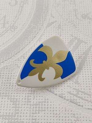 dreieckiges Schutzschild, abgerundete Ecken, goldenes Symbol und zwei blauen Ecken auf weißem Hintergrund