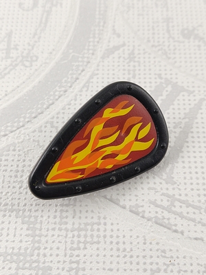 dreieckiges Schutzschild, schwarz, abgerundete Ecken, gelbe und orange Flammen auf dunkelrotem Hintergrund