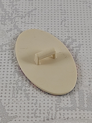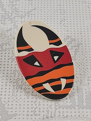 ovales Schutzschild, rot-orange-schwarzes "Gesicht" auf beigem Hintergrund