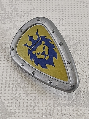 dreieckiges Schutzschild, silber, abgerundete Ecken, blauer Löwenkopf mit Krone auf gelben Hintergrund