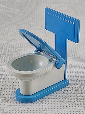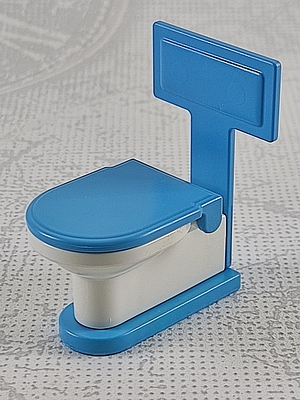 weiße Toilette mit hellblauem Spülkasten, Sockel und Deckel